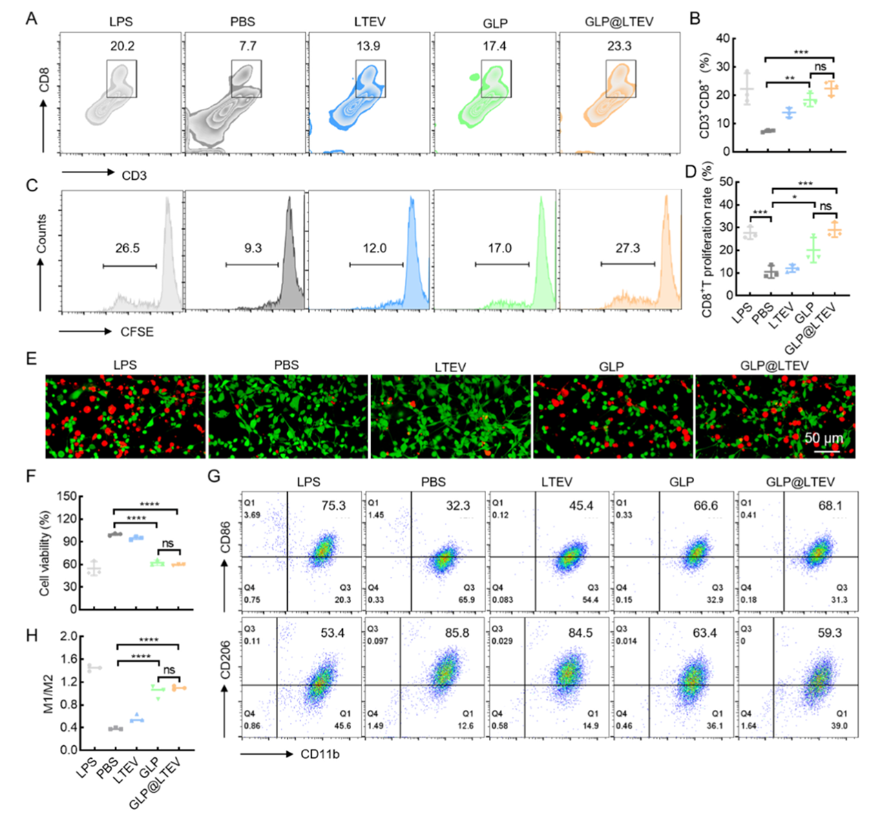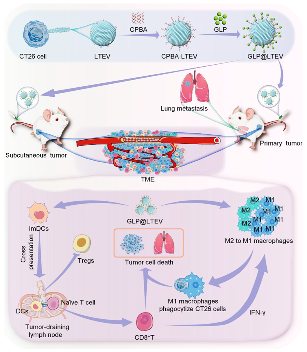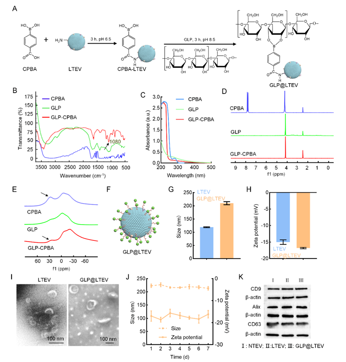 研究团队以4-羧基苯硼酸为“连接桥梁”,将灵芝多糖与经低pH培养基重编程的CT26结肠肿瘤细胞来源外囊泡进行共价结合,成功构建出灵芝多糖修饰的肿瘤细胞外囊泡纳米体系GLP@LTEV。一系列实验证实该体系制备成功,粒径与电位在体外能保持稳定,且能在肿瘤微环境的酸性条件下实现灵芝多糖的可控释放,同时完整保留了肿瘤细胞外囊泡的核心功能。