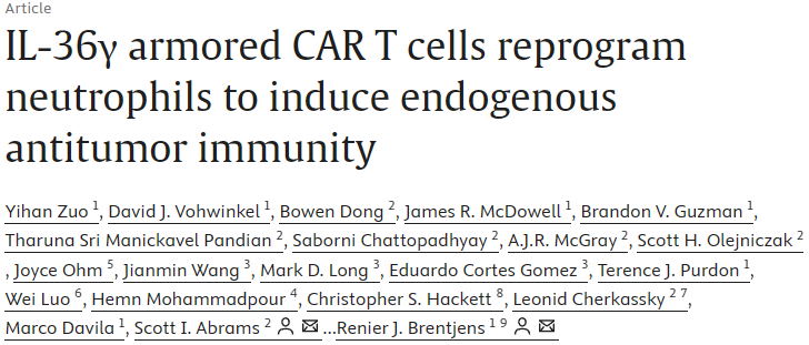 该团队(包括第一作者Yihan Zuo博士和共同资深作者Scott Abrams博士)首次证明,用细胞因子IL-36γ"武装"的CAR T细胞可以重编程称为中性粒细胞的白细胞,从而激活针对实体瘤的先天性免疫反应。他们的研究结果发表在《Cancer Cell》上。