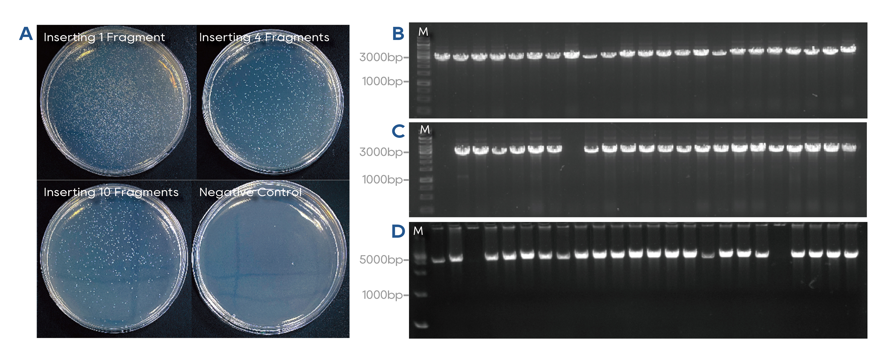 - (D) Agarose gel electrophoresis of colony PCR products for 10 fragment insertions.
